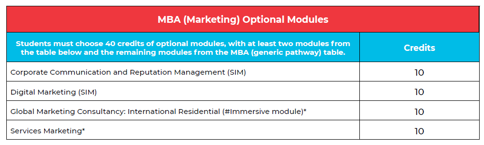 | * Additional optional modules are available for students who choose to study at the UK or Dubai campuses, or study fully online via the MBA Distance Learning (DL) platform. These modules are managed by the respective campuses or the DL programme team, as they are not delivered at SIM and will not be reflected in the student’s contract. # Only one of which can be an immersive module. Students may choose to study 3 optional modules in-person in UK or Dubai campuses or via the online MBA distance learning. before this line. The modules listed here and on the University’s website may occasionally be subject to change to ensure consistency with the UK programme. In such a scenario, you will be informed of any changes. |